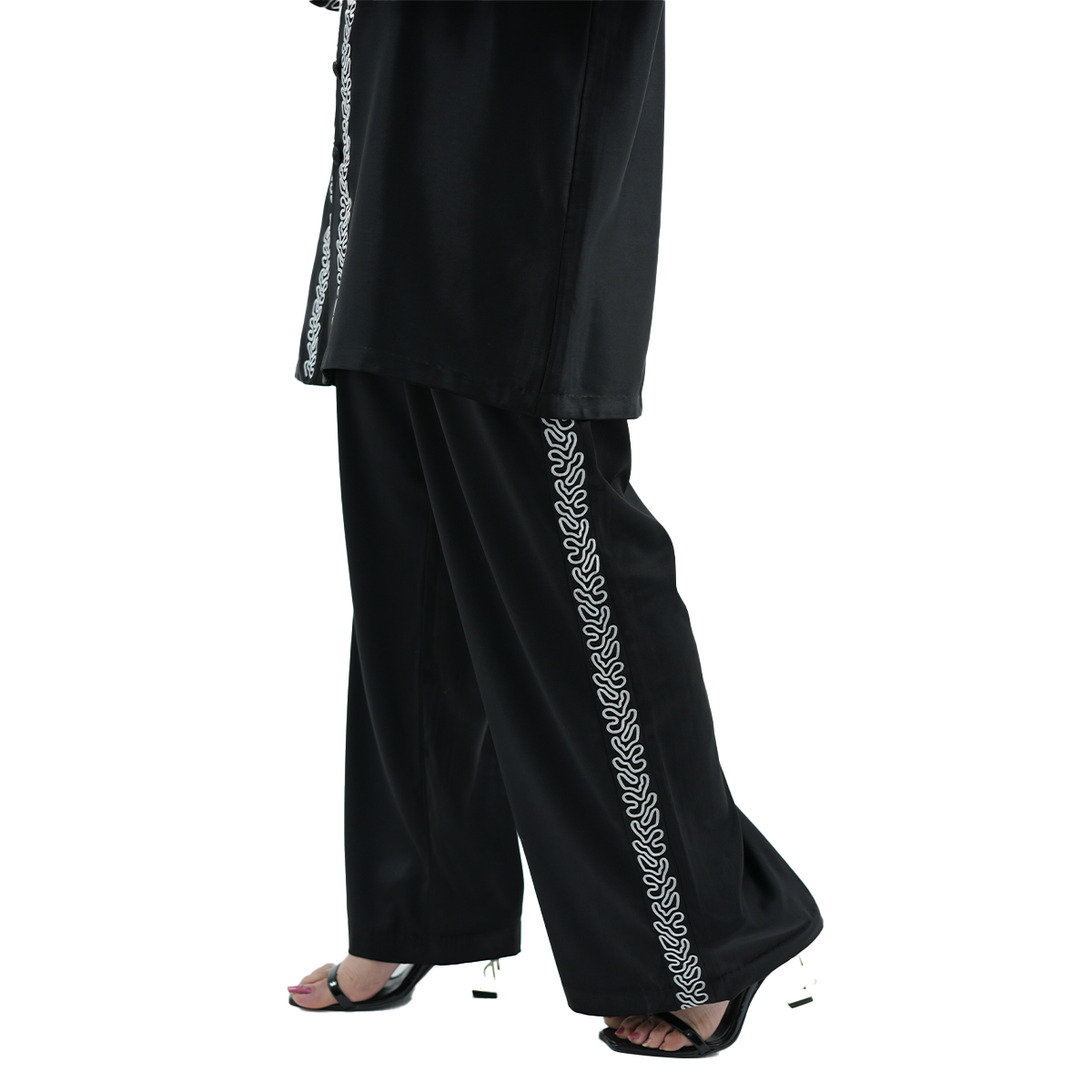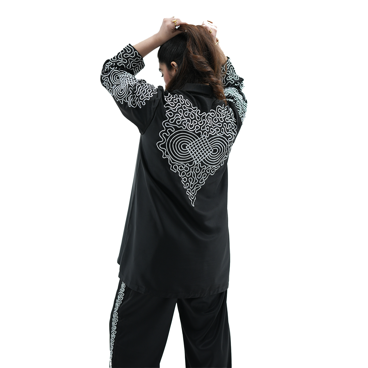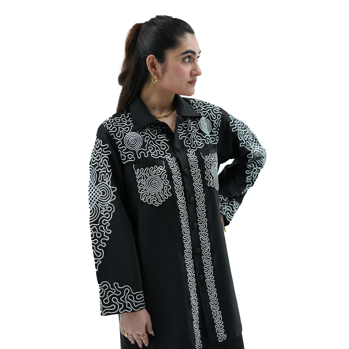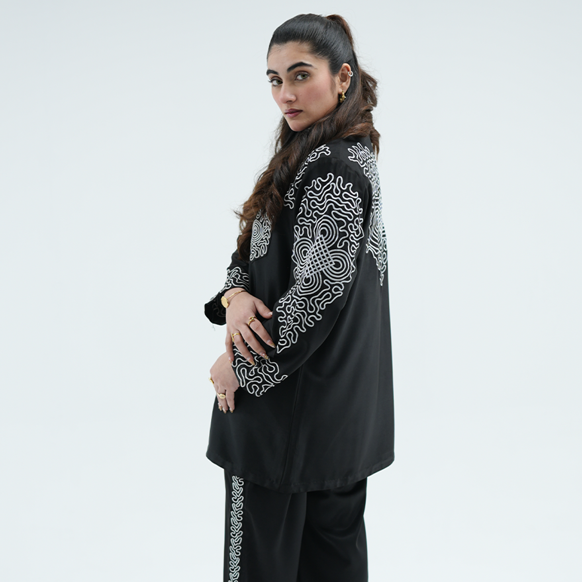 What truly sets this piece apart is its heavy embroidery, back as well as sleeves that have been very well detailed. The shirt has two embroidered pockets and gives the shirt style and sophistication, the matching embroidery is done on the trousers to give the shirt a complete and balanced high-end look. The Black Monarch Co-Ord Set will go to women who like to stand out with confidence, grace and unrestricted luxury.