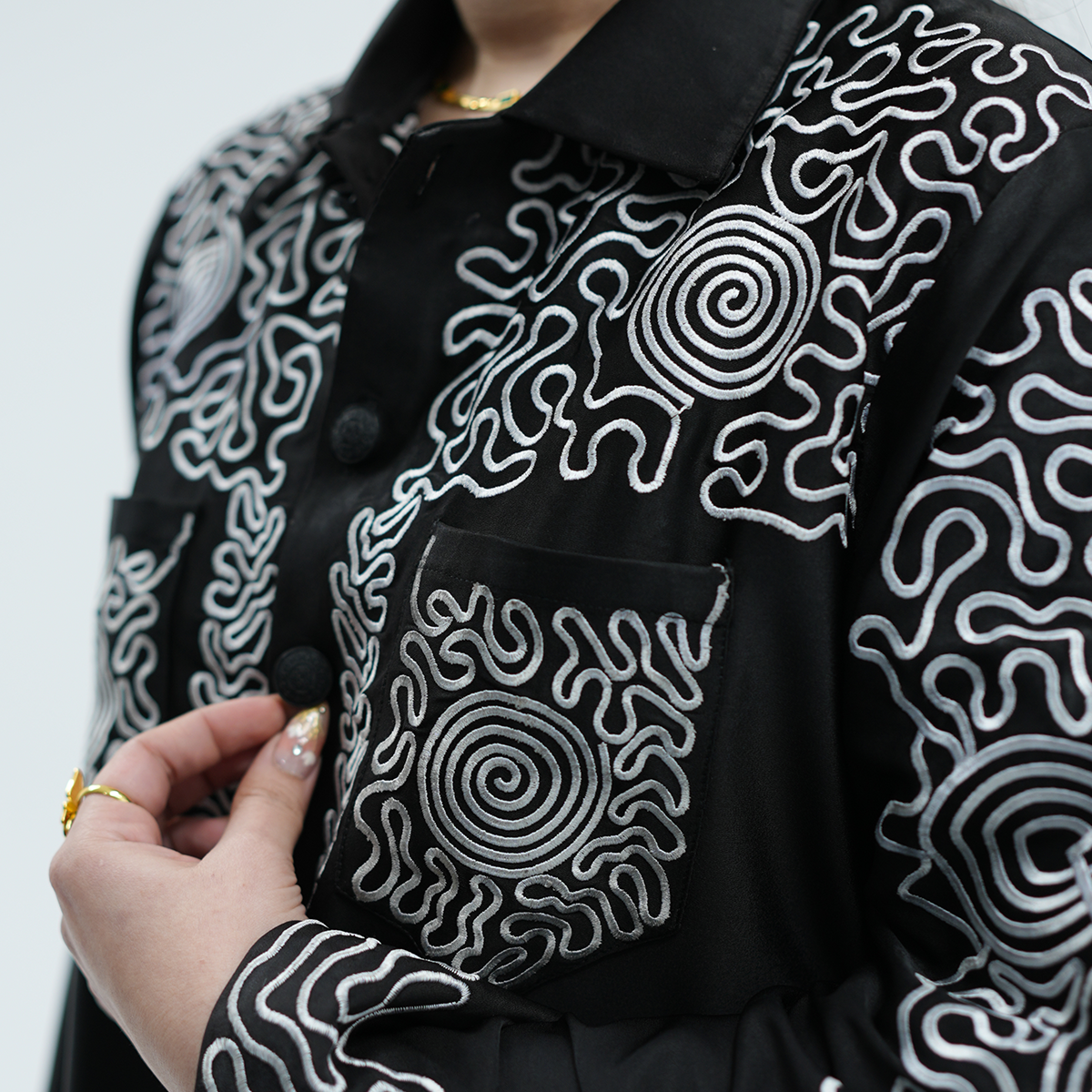 Dry cleaning is recommended to protect the embroidery, maintain the fabric quality, and preserve the deep black color.