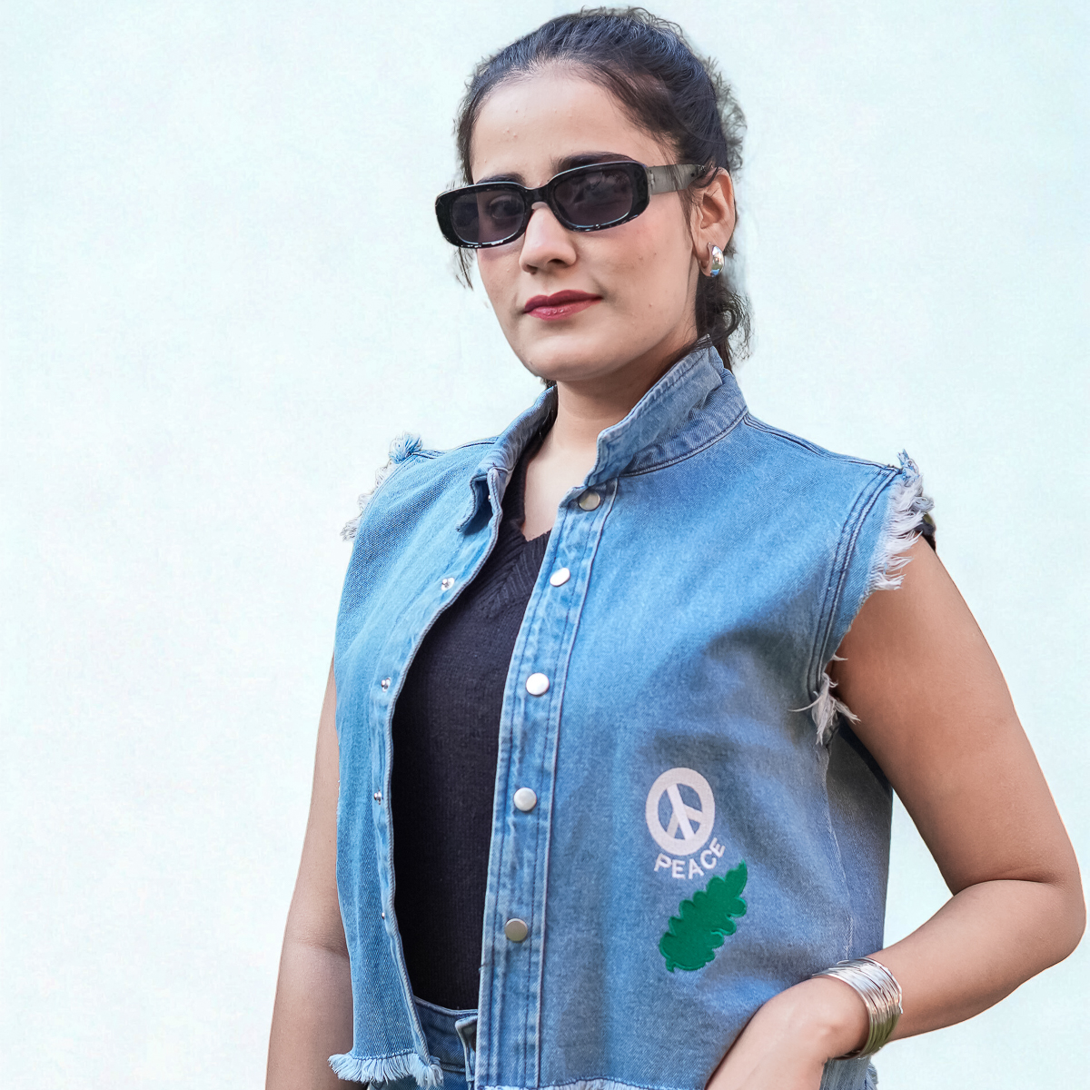 The front and back feature detailed embroidery, giving the shacket a unique handcrafted feel. Ripped and patched accents add an edgy touch, making this shacket women’s style a perfect mix of rugged and fashionable. Each piece carries the “Peace Embrace” detailing, matching our jeans set, symbolizing confidence, strength, and individuality.