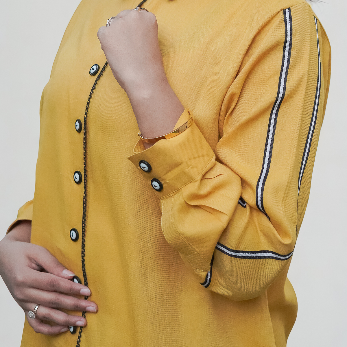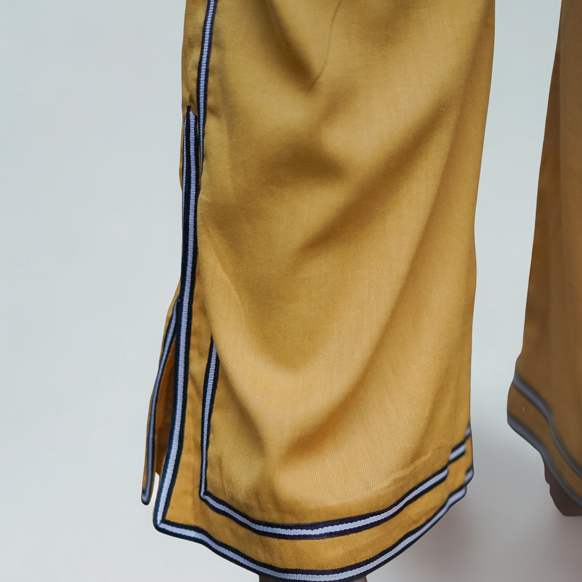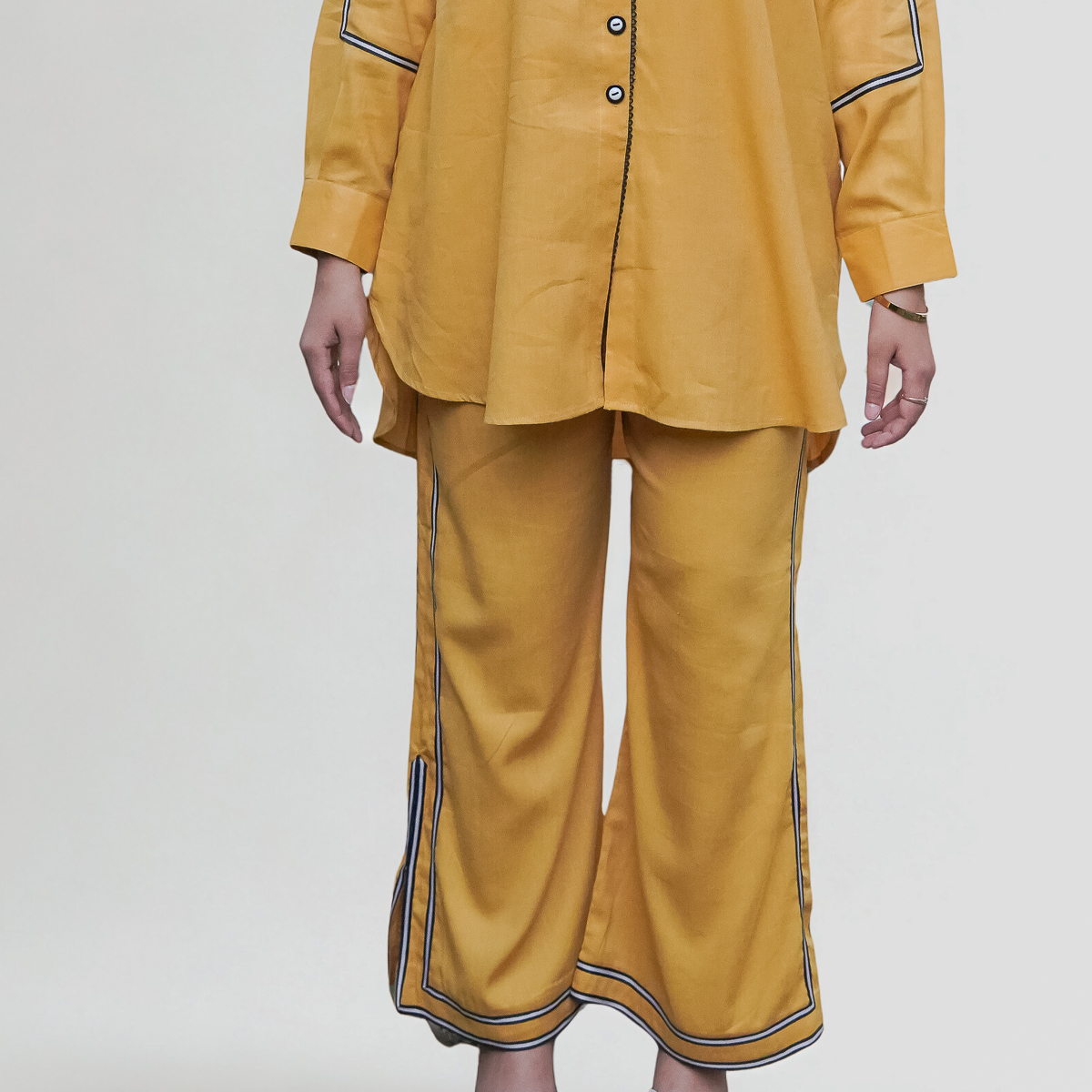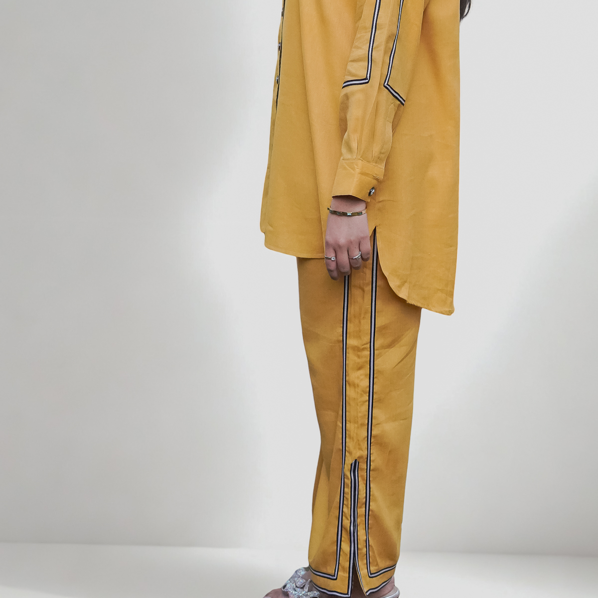 The Mustard Kiss Co-Ord Set is a brighten-up item of your wardrobe made in a beautiful mustard yellow color, which would bring warmth and charm to your appearance. This co-ord set will be ready to wear in soft and breathable cotton fabric. The sleeves and trousers have black and white detailing which provides a sharp contrast to the outfit making the outfit appear modern and eye-catching.