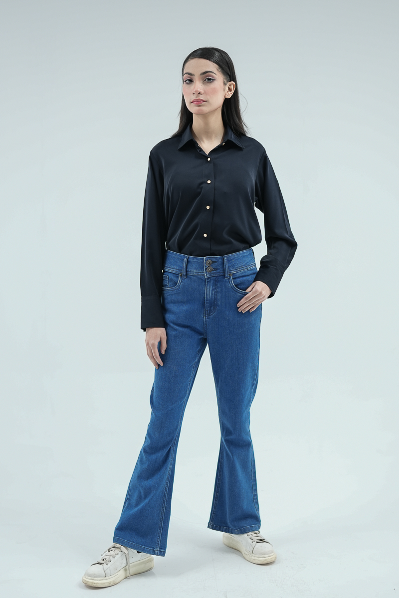 These flare blue denim pair perfectly with tucked-in tops, heels, or sneakers, ideal for both casual and semi-formal looks.